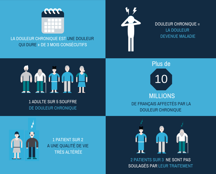 12 millions de Français au moins souffrent de douleurs chroniques, autrement dit de douleurs permanentes, subies pendant au moins trois mois consécutifs, aux conséquences physiques, morales et sociales importantes.